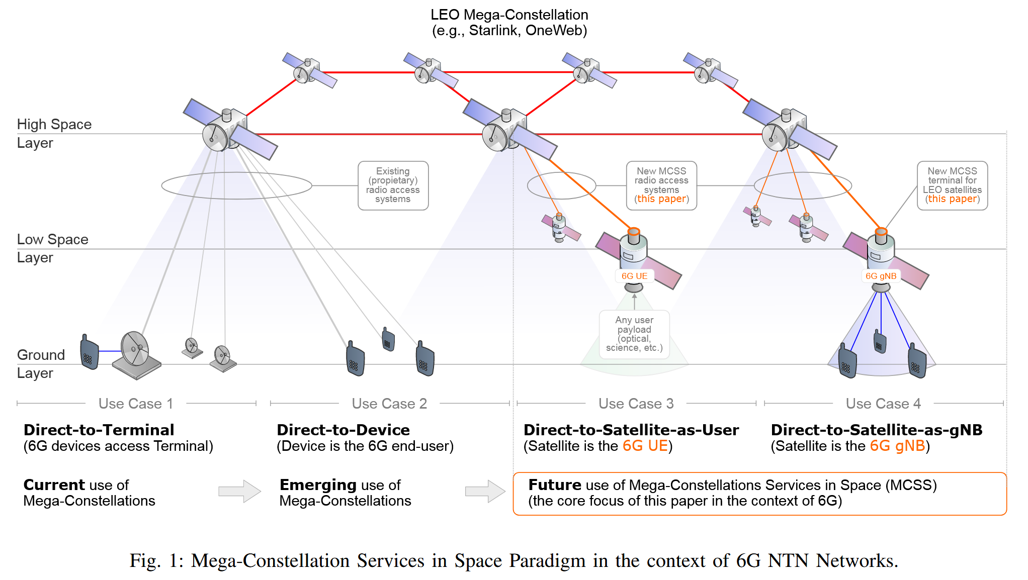 “The exploration of leveraging LEO mega-constellation linksfor communication began with H. Al-Hraishawi et al. in 2021 [26], where multi-layer space information networks were considered. This concept was further expanded upon by G.Maiolini Capez et al. in 2023 with a detailed characterizationof the Mega-Constellation links for LEO Missions [27]. Inthe same year, H. Chougrani et al. contributed a feasibility study, emphasizing the significant potential of MCSS [28].” Page 4