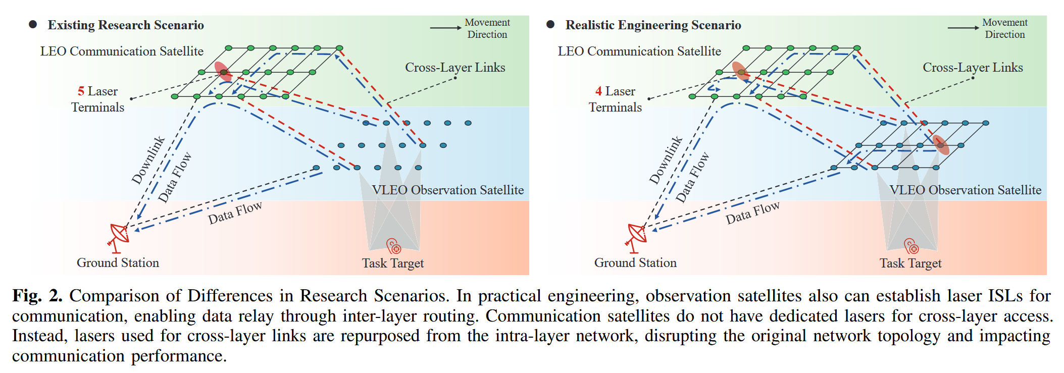 ”• Laser Quantity and Installation Location Issues: In existing research scenarios [17], [18], communication satellites must be equipped with additional lasers specifically for crosslayer access. In practical scenarios, only lasers on both observation and communication satellites, used for intra-layer ISLs, can be reallocated for cross-layer topologies when needed. This reallocation can disrupt the original topologies of both networks.” Page 3