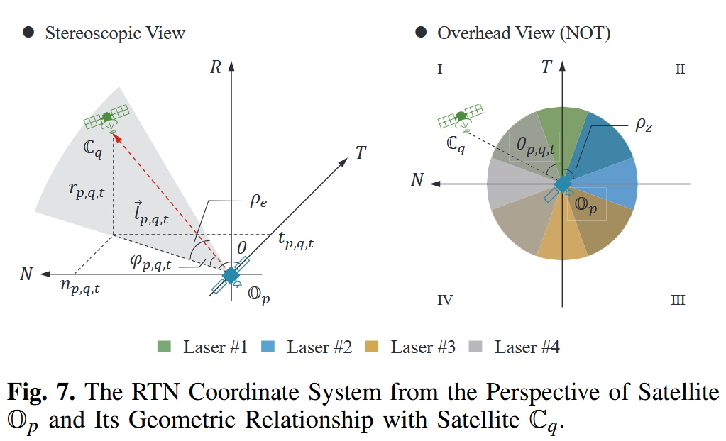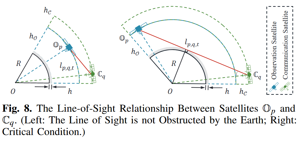 - “Then, we define Ξp,t as a binary matrix representing the cross-layer topology planning results of PO VLEO satellites and QC LEO satellites at time t, and matrix Ap,t ai, j p,q,t ∈ Ap,t to represent their visibility relationship. Here, xi, j p,q,t xi, j p,q,t ∈ Ξp,t signifies the access status of the i-th laser terminal of satellite Op and the j-th laser terminal of satellite Cq. If xi, j p,q,t &ai, j p,q,t = 1, it indicates that satellites Op and Cq establish a cross-layer links and transmit data.” Page 9